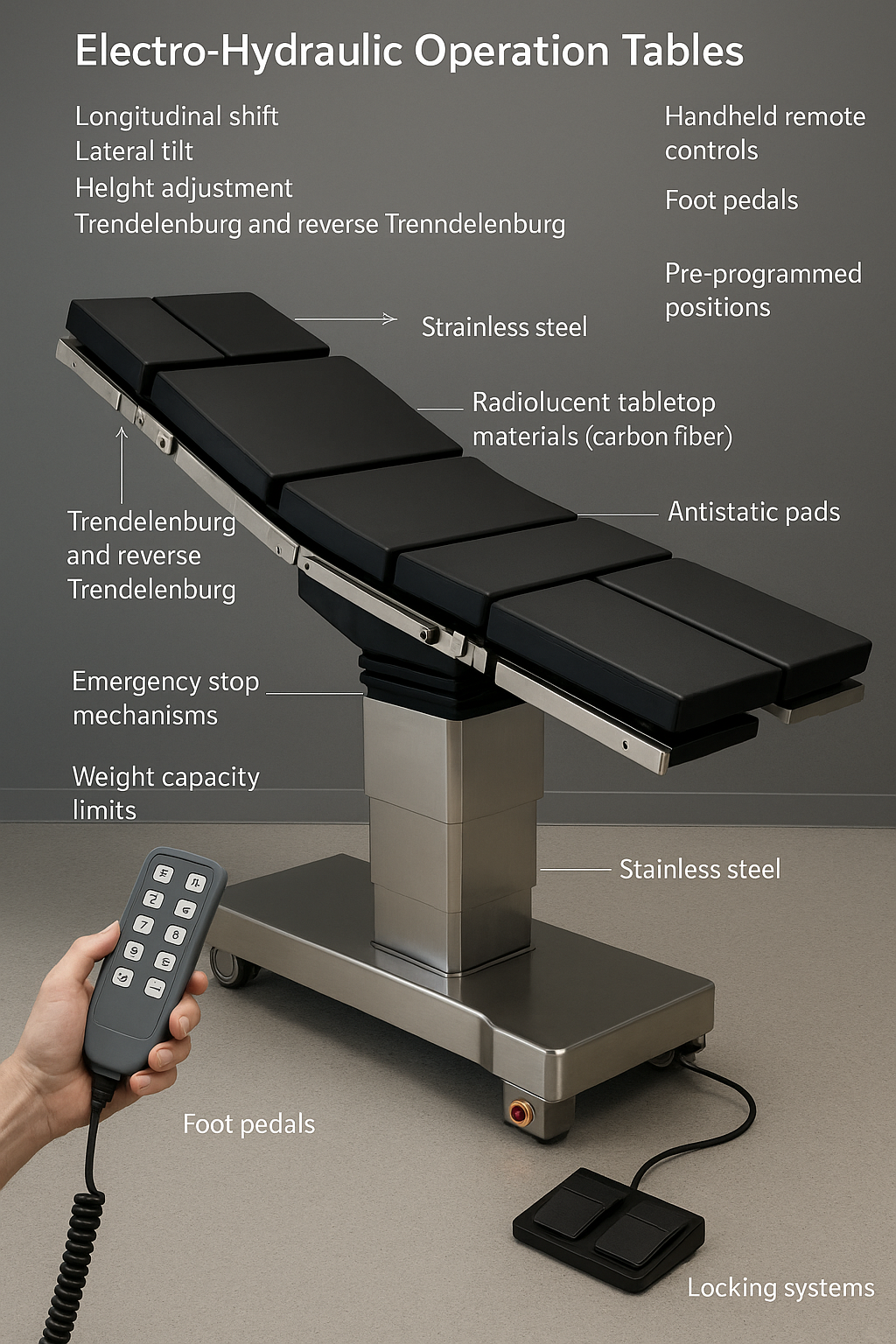 | リモコンまたはフットコントロール | ユーザーフレンドリーな調整コントロールを提供 | 医療スタッフの手作業を軽減 |