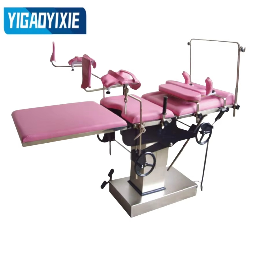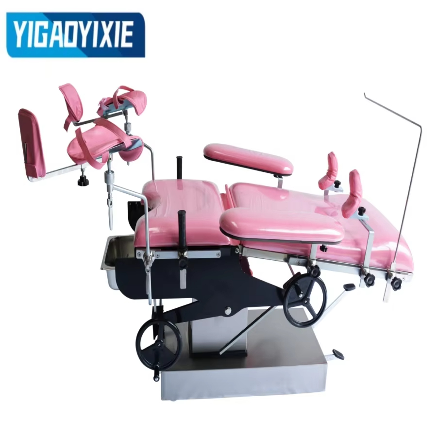 3. 分娩台の両側にあるハンドル、ウォームギヤ、タービン、ギヤラック伝動装置を振ることにより、前傾、後傾、背板の折りたたみなどの調整を行います。
